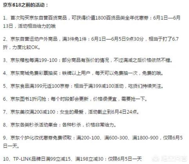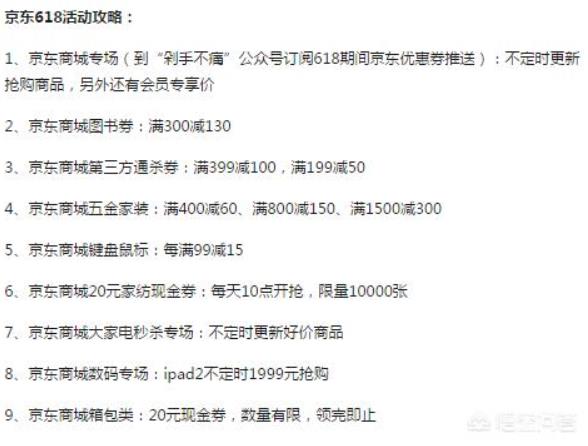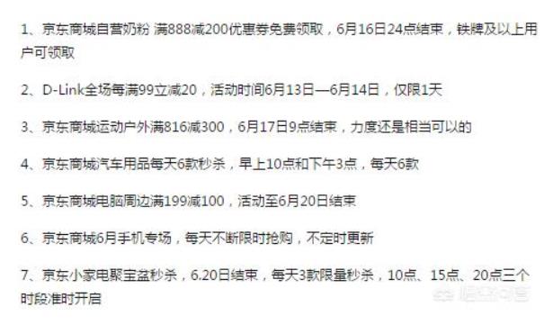除了手机品类,3C数码、大小家电、服饰、母婴等都开启了优惠,也就是说全网优惠,服饰满2件打八折、买三免一等,最多的优惠就是满199元减100元,还有一些优惠券。不过,还是要注意一点,京东6·18有的品牌商品是有时间段的优惠,例如:京东商城运动户外满816减300,6月17日9点结束;京东商城汽车用品每天6款秒杀,早上10点和下午3点,每天6款,价格优惠程度都是比较大的,还要把握好时间啊。