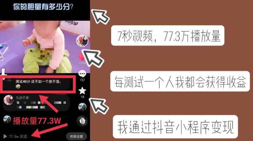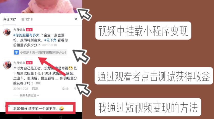 发布视频的时候带上小程序,有人点开这个小程序做了测试,视频的创作者就会获得一份收益。