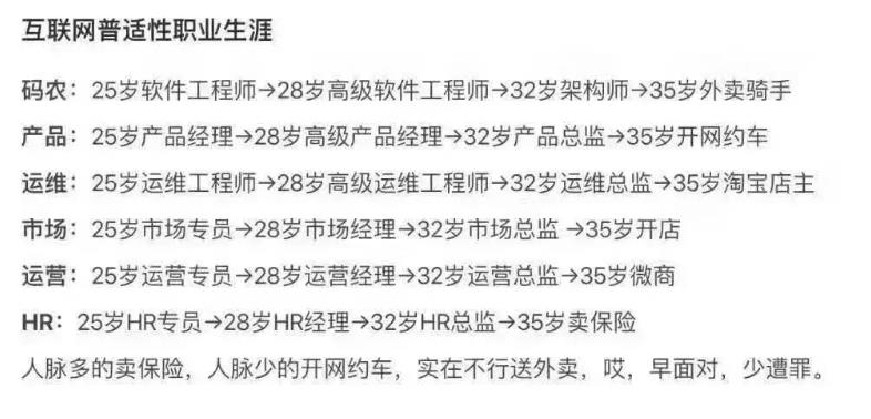 第二条就是干到35岁左右了,这是彻底的转行,进入新的行业,可能是因为被动的没攻和打,因为中间危机,那么就这个时候绝大部分人会从事偏服务或者是偏体力型的工作,就比如说开滴滴送外卖这类的人不少。