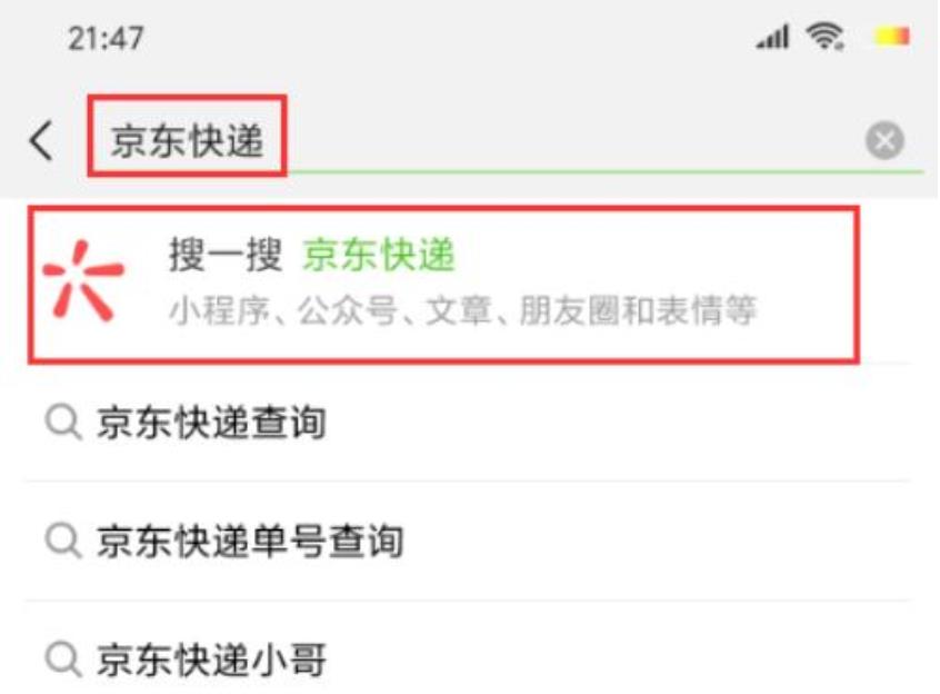 1、在搜索栏中输入“京东快递”,点击栏目中的搜一搜后,找到“京东快递”的小程序,并点击进入