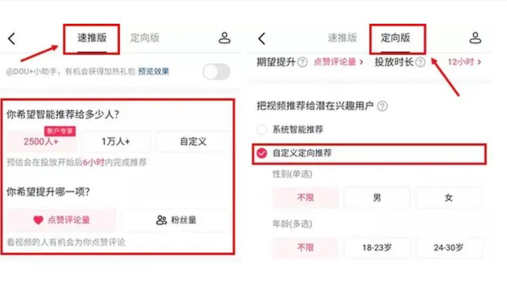3、定向版推广是指按照您的要求向指定人群推广短视频,以获得短视频的点赞评论量或者粉丝量,而与速推版最大的区别在于定向版可以手动选择推广时间,同时推广对象选择比较多。
